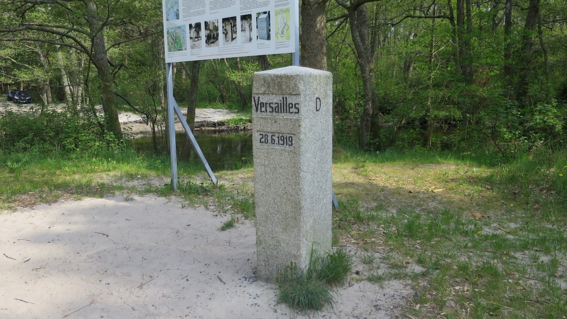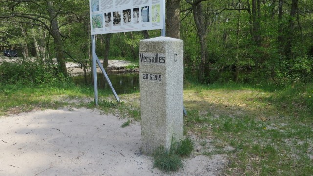 Lądowa linia graniczna została oznaczona w terenie granitowymi słupkami z wyrytym napisem Versailles 28.6.1919 (odnoszącym się do podpisanego traktatu) oraz literami P (Polska) i D (Niemcy). Na terenie Powiatu Puckiego umieszczono 118 takich kamieni. Największy - oznaczony numerem pierwszym - znajdował się w pobliżu brzegu morskiego na zachodnim brzegu rzeki Piaśnicy koło Dębek. Kamień numer 1 był wówczas częstym celem wycieczek Polaków szczęśliwych z powodu uzyskania przez Rzeczpospolitą dostępu do morza. Po II wojnie światowej granica polsko-niemiecka została przesunięta o około 400 km na zachód i dziś powoli zanika świadomość, że to na rzece Piaśnicy znajdował się północno-zachodni skraj II Rzeczypospolitej. Zrekonstruowany kamień graniczny w Dębkach znajduje się w zachodniej części wsi przy rzece Piaśnicy. Na miejscu znajduje się również tablica informacyjna.