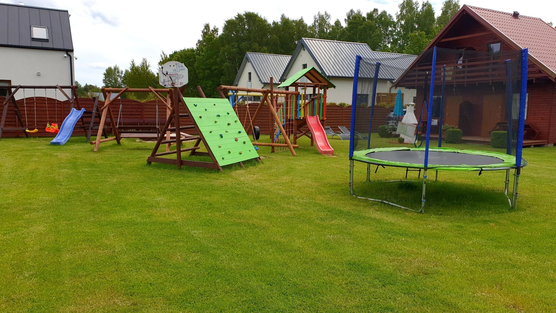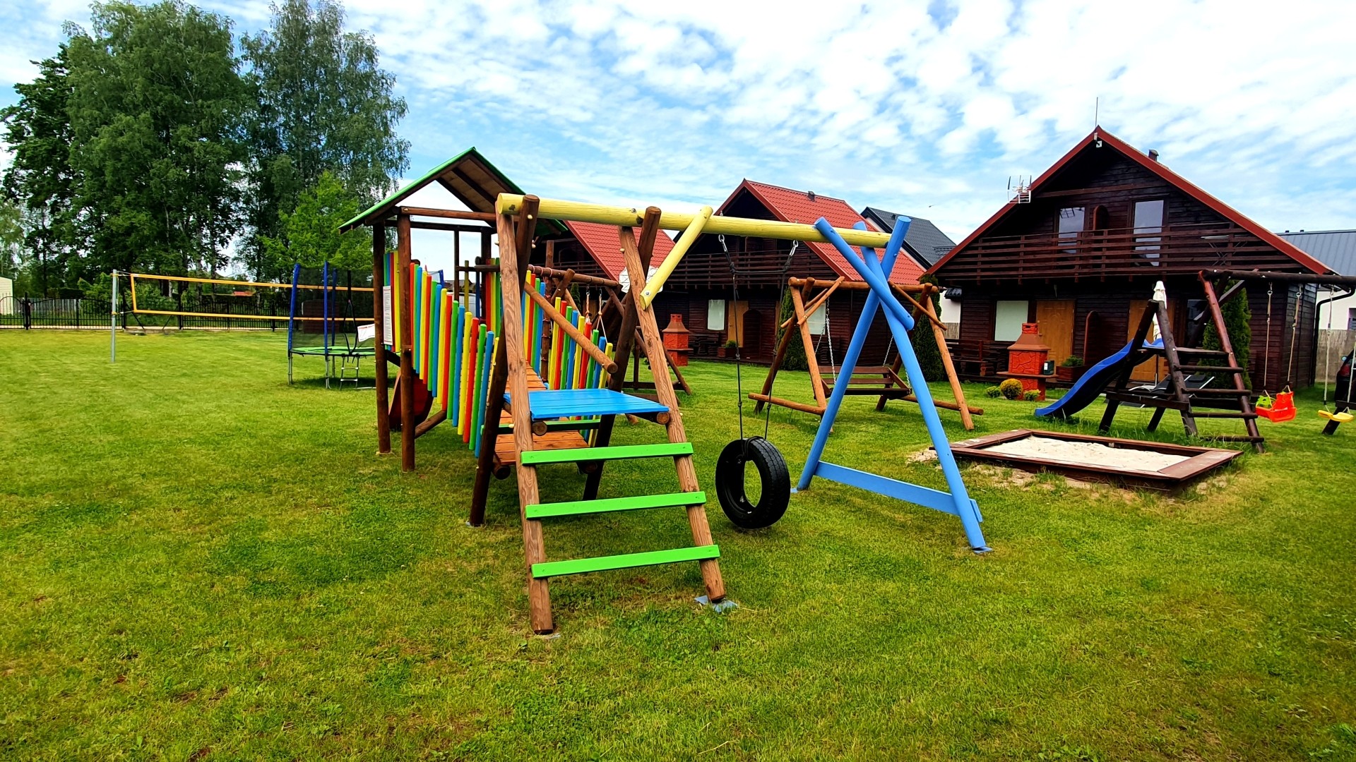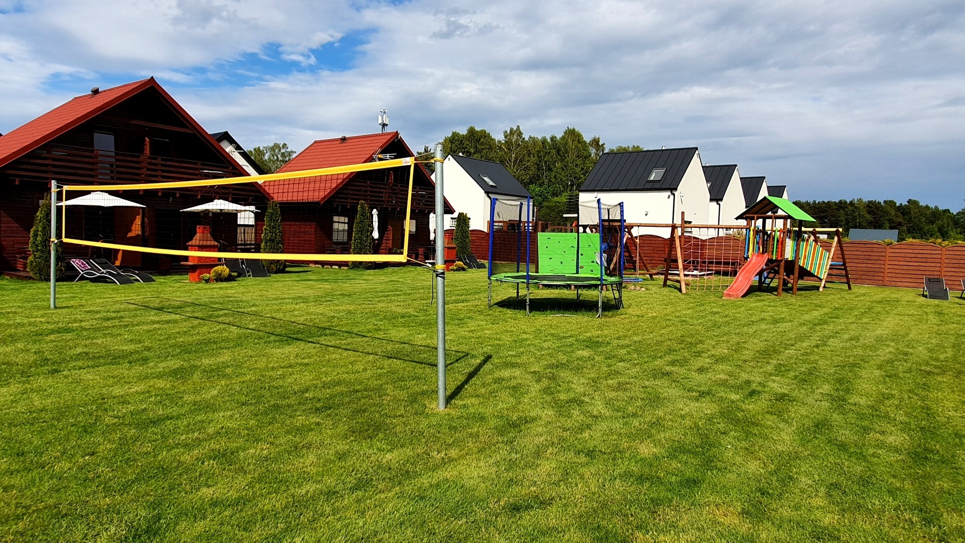Teren wokół domków ma 2000m2, jest ogrodzony, posiada miejsca parkingowe oraz plac zabaw dla dzieci z huśtawkami, piaskownicą i trampoliną, boisko do gry w siatkówkę. Nasz ośrodek to wymarzone miejsce dla rodzin z małymi dziećmi.