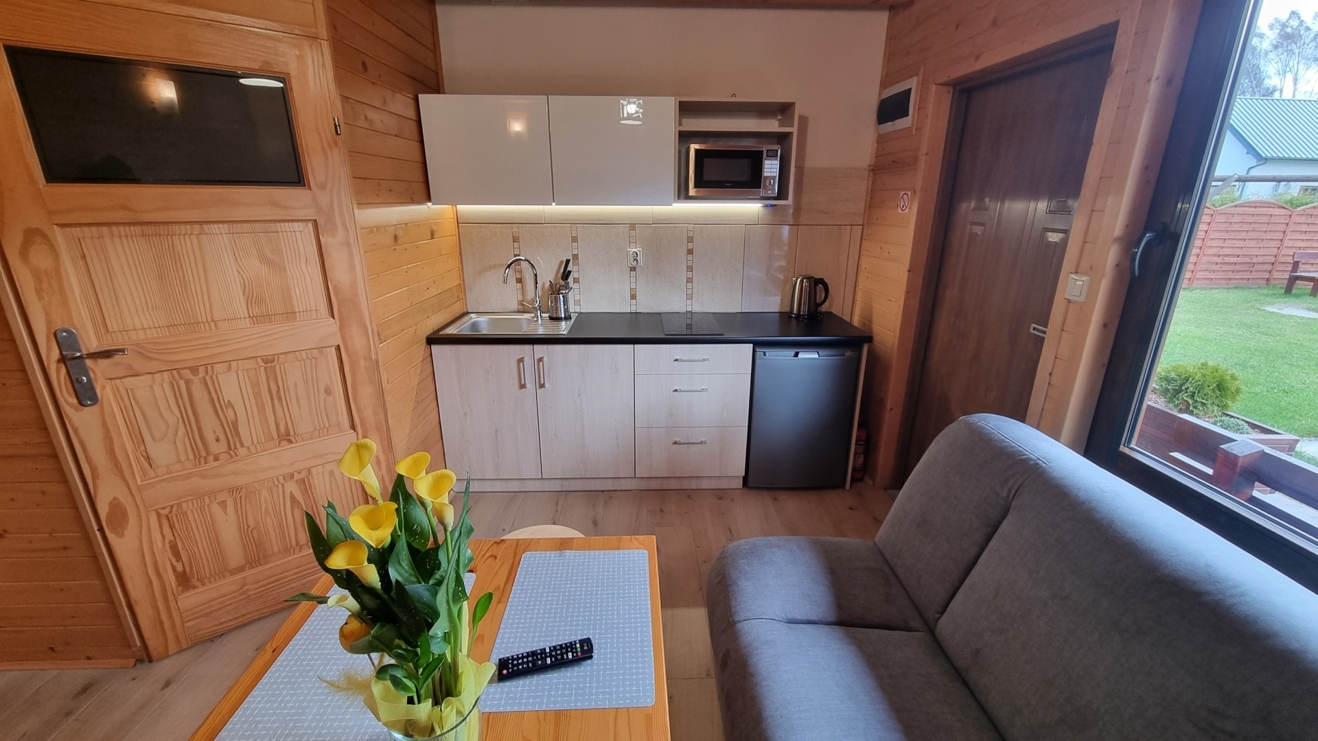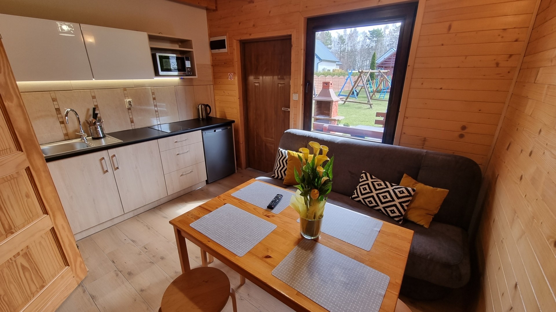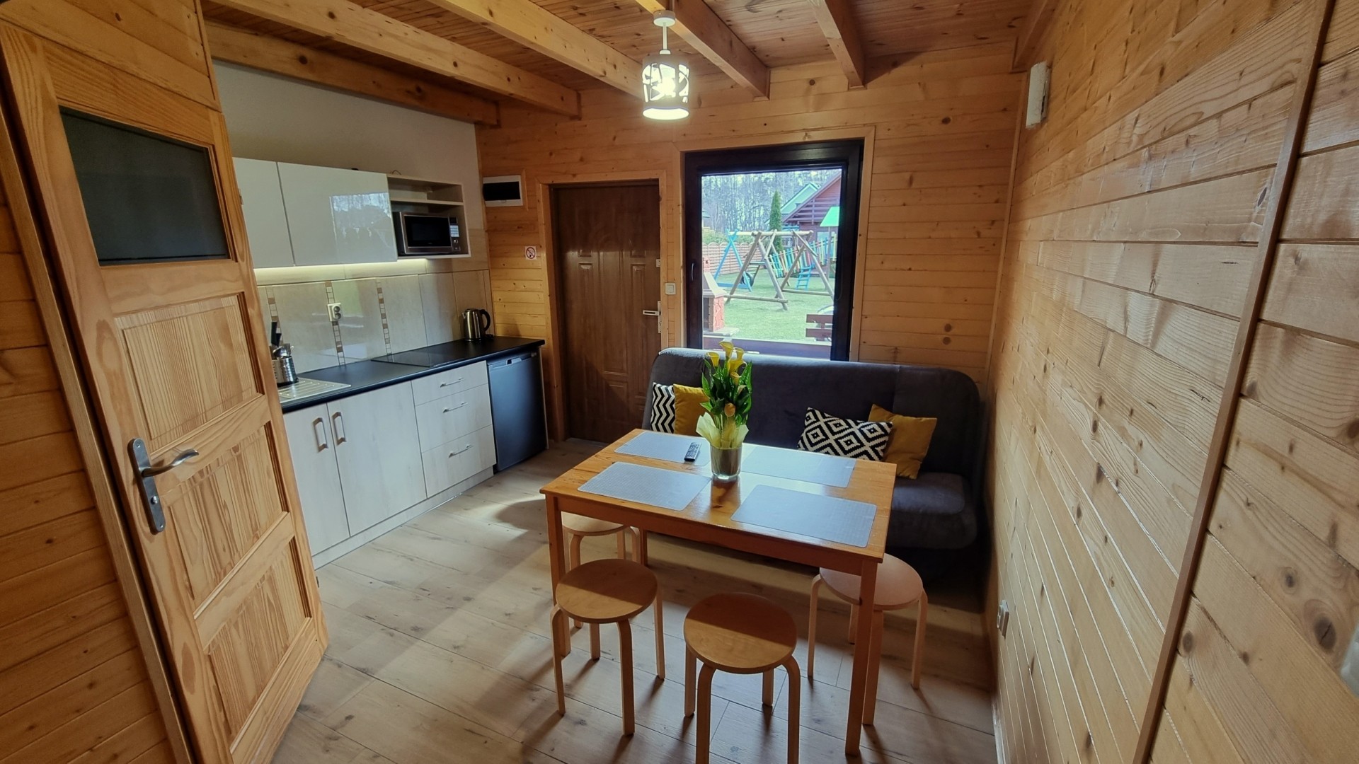 Przy każdym domku znajduje się taras, na którym dostępny jest komplet drewnianych mebli ogrodowych, grill.